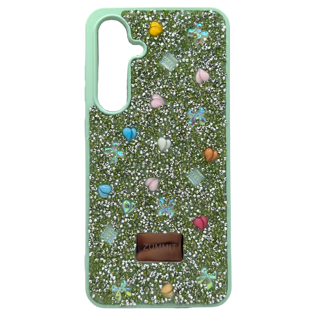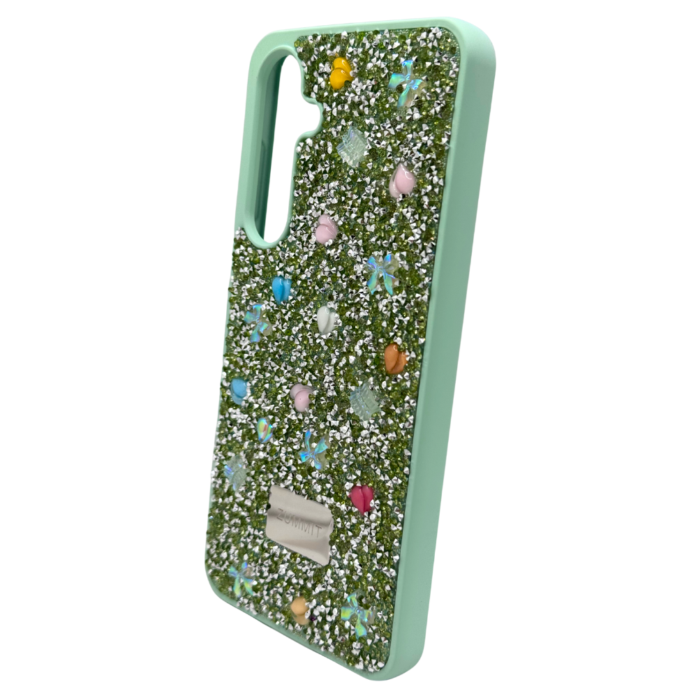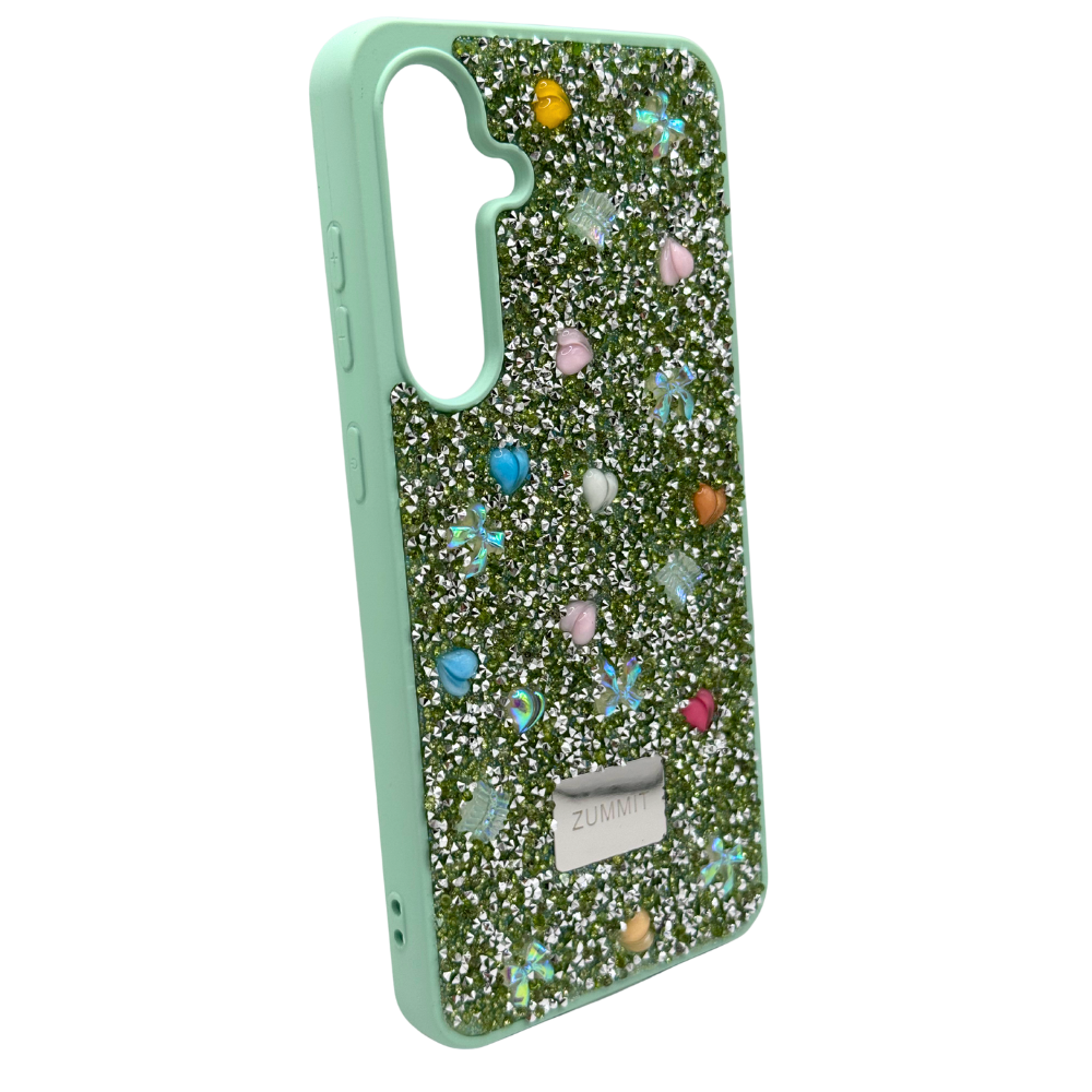 Diseño Exclusivo y Lleno de Brillo: El acabado glitter en tono verde menta le da un toque de frescura, mientras los pequeños dijes en forma de mariposas, corazones y perlas añaden una vibra super chic y divertida. ¡Tu teléfono nunca se verá tan cool!