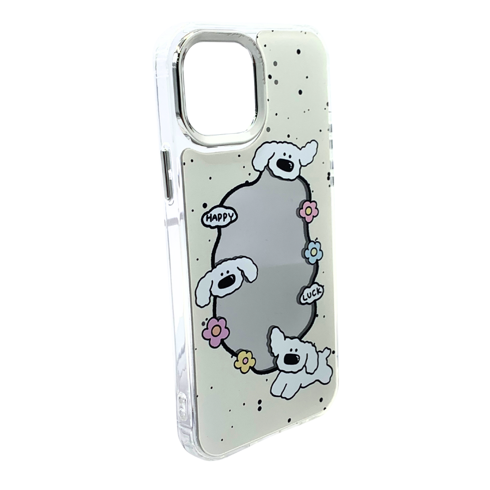 ¿Buscas una carcasa que no solo proteja tu celular, sino que también tenga un detalle increíble que te sorprenda? ¡La acabas de encontrar! Te presentamos nuestra Carcasa Exclusiva para iPhone 12 y iPhone 12 Pro con Diseño de Perritos y un Espectacular Efecto Espejo en el Centro. Imagina: tus tiernos perritos favoritos y mensajes optimistas como "Happy" y "Luck" rodeando un brillante centro espejado donde podrás ver tu reflejo en un instante. Con un fondo de color suave [Asumir color si es visible, ej., "blanco crema suave" o "gris pálido"] y un diseño súper cool, esta funda es la combinación perfecta de estilo, protección y un toque mágico para tu iPhone 12 y iPhone 12 Pro en Chile
