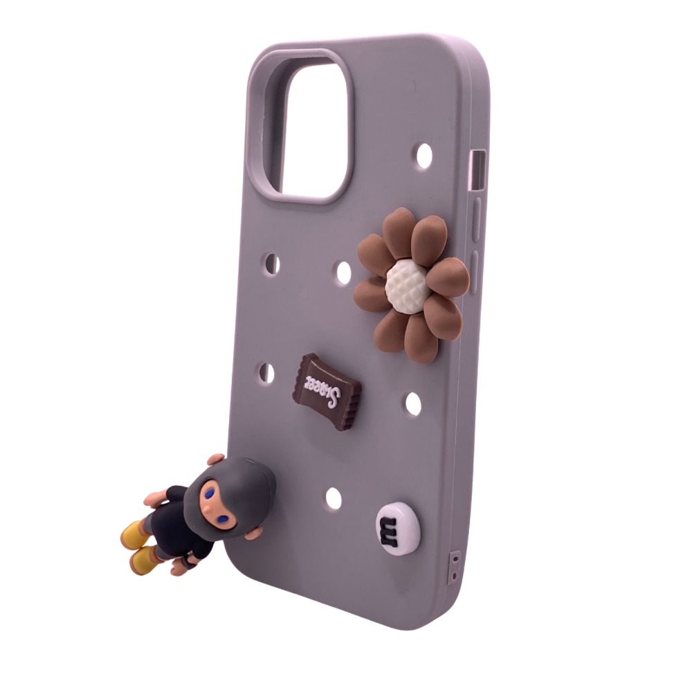 - Adornos 3D Divertidos: Incluye pines removibles de un personaje, una flor marrón, un dulce y la letra "m", para que personalices tu funda y expreses tu estilo único.