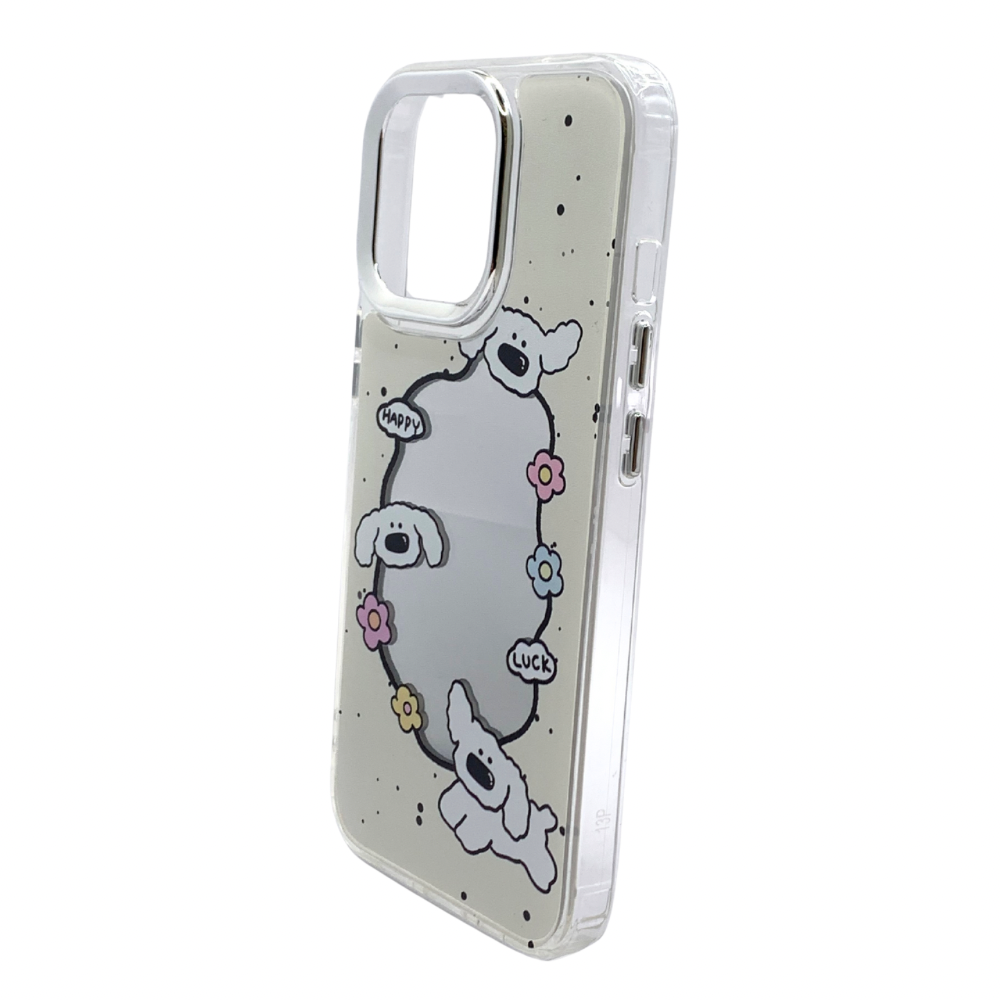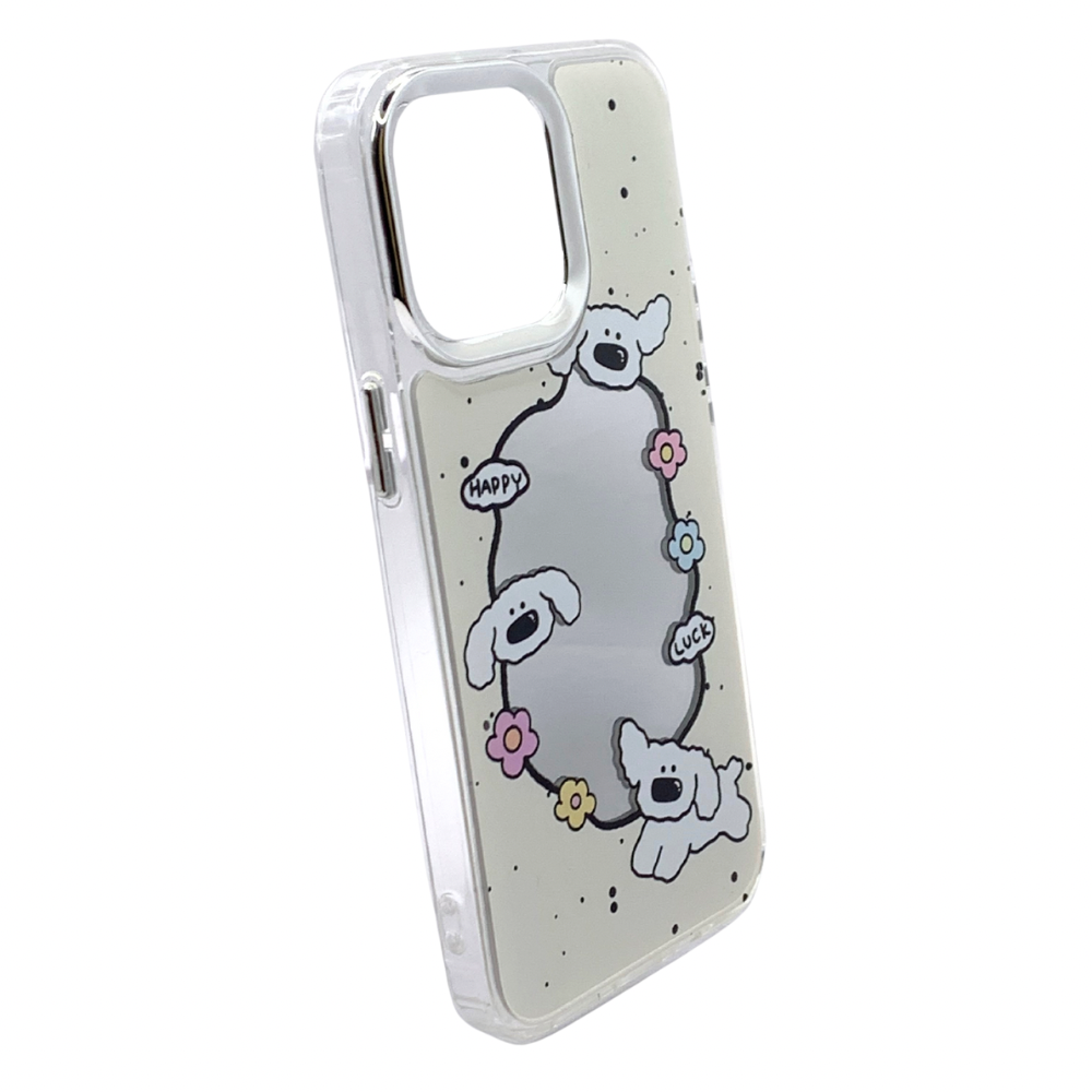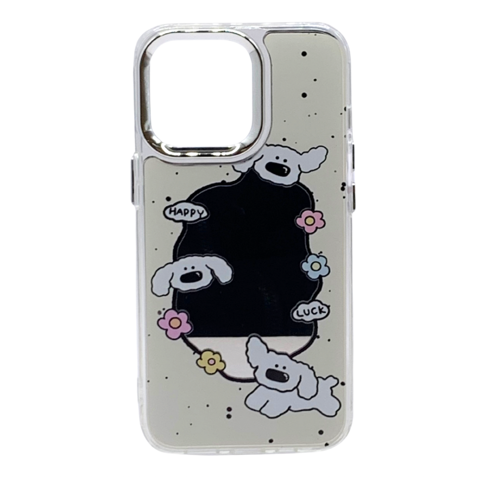 Añade un toque de felicidad y protección a tu iPhone 13 Pro Max con esta adorable carcasa transparente. Su diseño presenta un marco en forma de óvalo con simpáticos perros y flores de colores, junto a las palabras "Happy" y "Luck". El fondo con motas oscuras y el borde metálico brillante le dan un toque moderno y único. Es la funda perfecta para quienes aman a los animales y buscan un accesorio que no solo proteja su teléfono, sino que también transmita positividad y alegría.