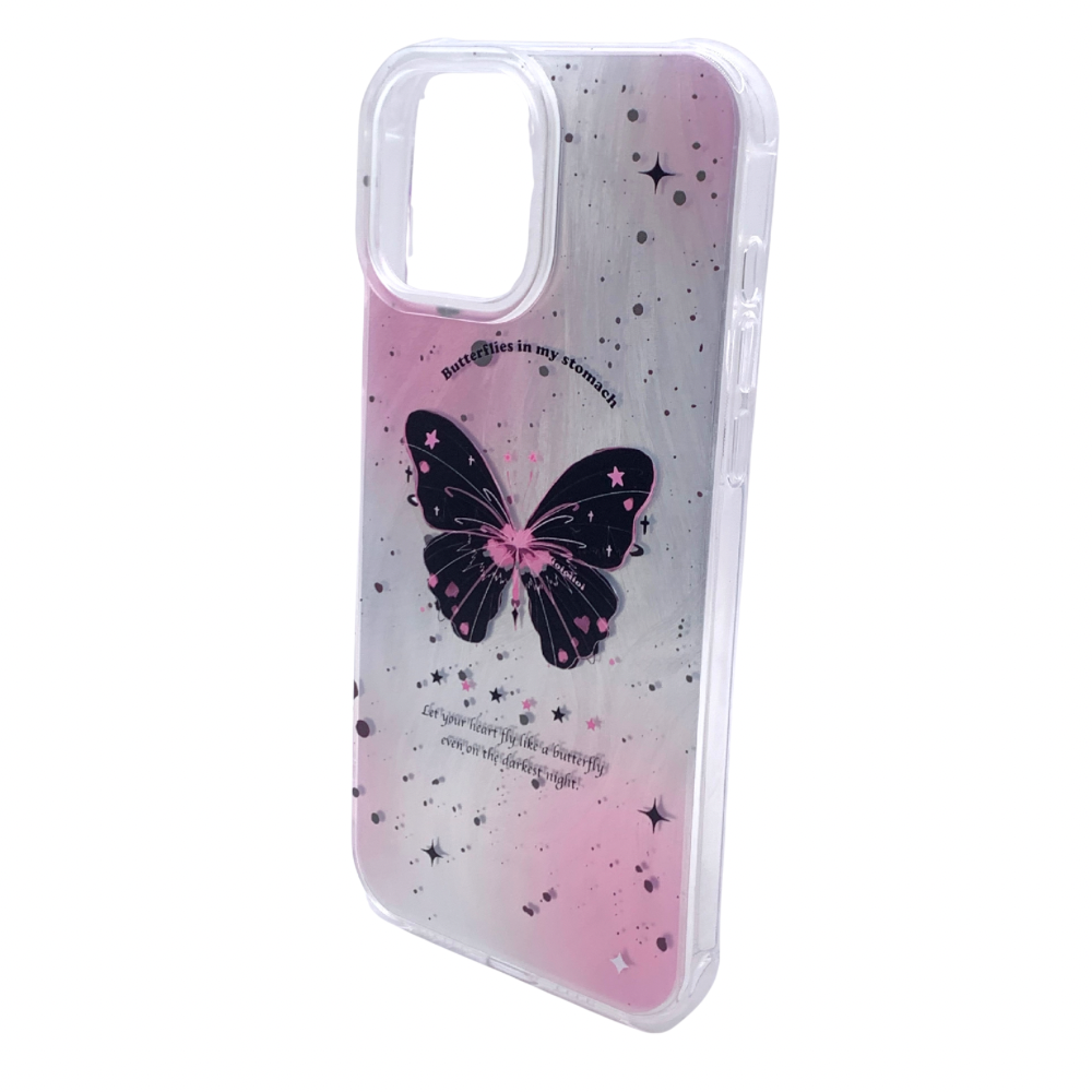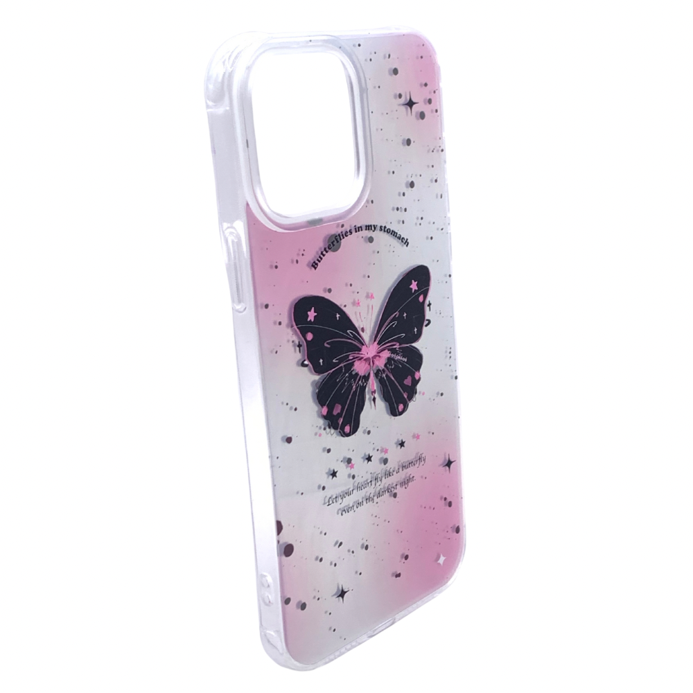 Añade un toque de ensueño y positividad a tu iPhone 13 Pro Max con esta encantadora carcasa transparente. Su diseño único presenta una delicada mariposa negra adornada con estrellas y detalles rosados, flotando sobre un fondo degradado en tonos pastel con sutiles brillos. Inspiradoras frases como "Butterflies in my stomach" y "Let your heart fly like a butterfly even on the darkest night" le dan un significado especial a este accesorio que no solo protege tu teléfono, sino que también te recuerda mantener la esperanza y la ilusión.