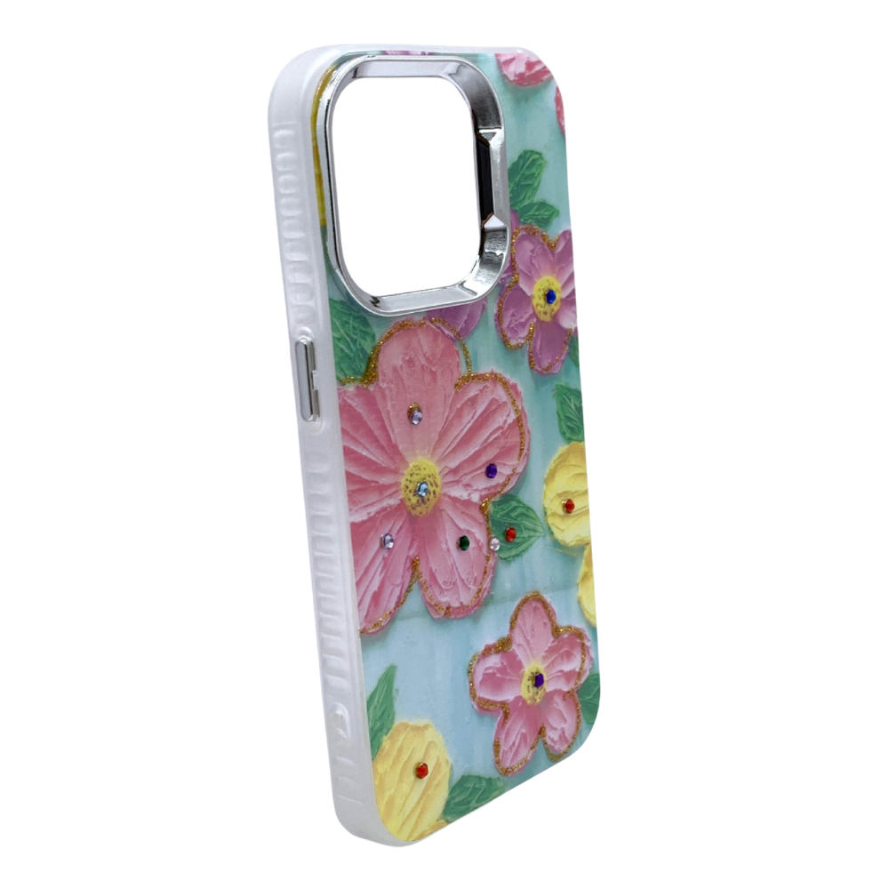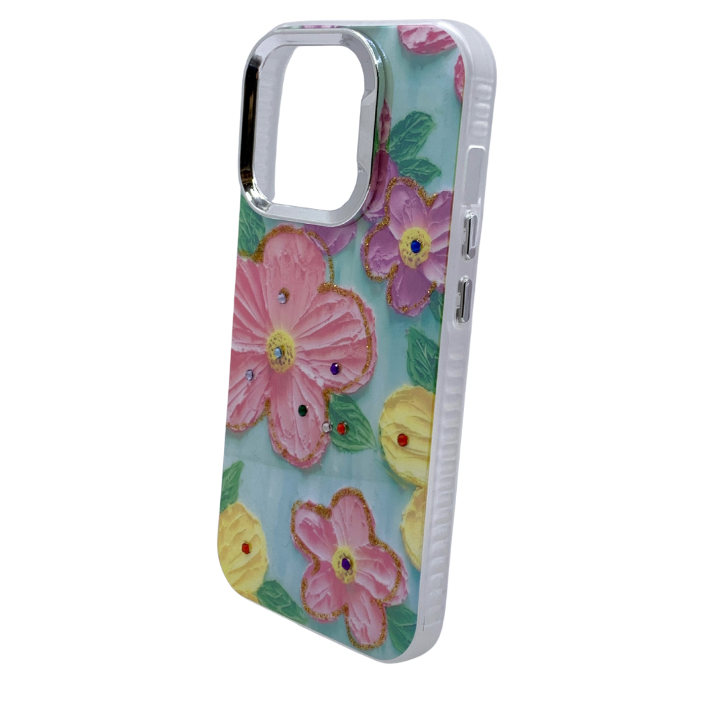 Transforma tu iPhone 15 Pro en una obra de arte con esta funda inspirada en un paisaje de ensueño. Con una estética que recuerda a la pintura de un cuadro, esta carcasa presenta una textura en relieve que simula un cielo con nubes y un campo de flores, todo en delicados tonos pastel. Cada detalle está cuidadosamente adornado con brillos dorados y pequeños diamantes incrustados que añaden un toque de lujo y encanto. El diseño único de la funda no solo es un accesorio llamativo, sino que también ofrece una protección sólida para tu teléfono. Es ideal para aquellos que buscan un estilo que combine creatividad, arte y un toque de fantasía en su día a día.