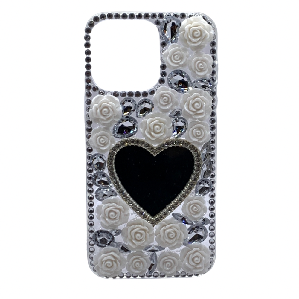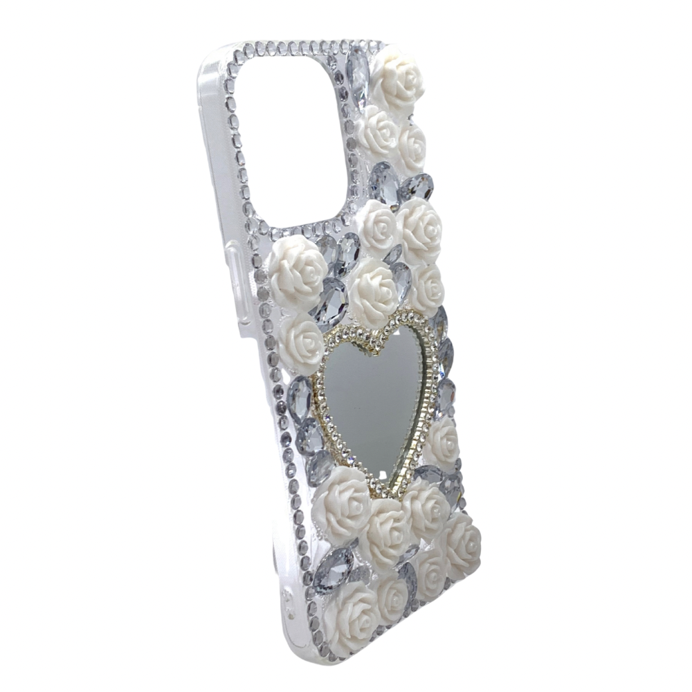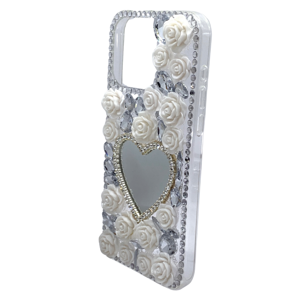 Protege tu iPhone 15 Pro Max con esta elegante y lujosa carcasa de diseño romántico. Su diseño de fantasía presenta delicadas rosas blancas en relieve, adornadas con brillantes cristales que le dan un toque de glamour y sofisticación. La característica principal es el espejo integrado en forma de corazón, perfecto para retoques rápidos y que sirve como un elemento central de estilo. El contorno de la cámara está reforzado con detalles de brillantes, brindando una protección extra para los lentes. Esta funda de alta calidad es ideal para quienes buscan una protección funcional y un accesorio que exprese su estilo romántico y glamoroso.