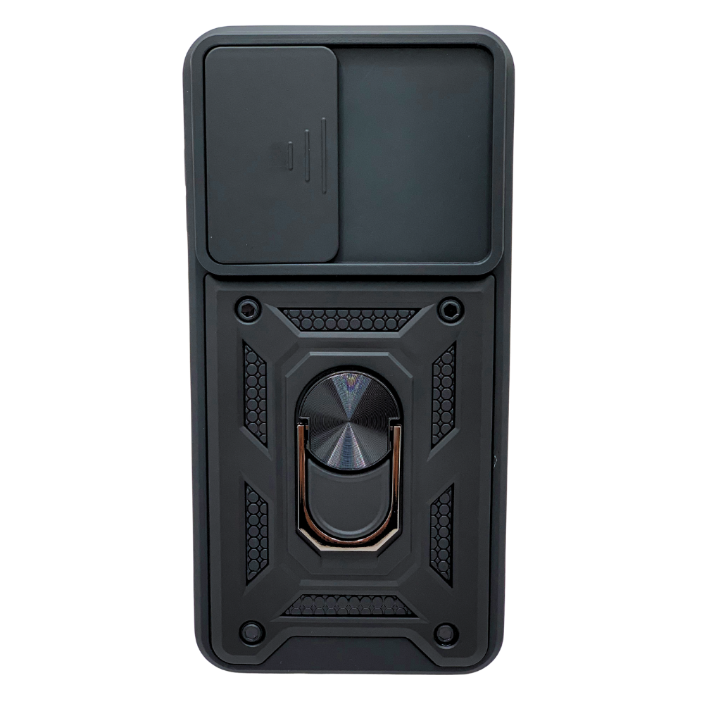 Ofrece una protección de nivel militar a tu Samsung A56 con esta funda táctica de alta resistencia. Cuenta con un innovador protector deslizante para la cámara que resguarda tus lentes de rayones y miradas no deseadas. El anillo metálico trasero te da un agarre seguro, previene caídas y funciona como un práctico soporte para ver videos. Su diseño reforzado y robusto absorbe los golpes. ¡La defensa más completa y funcional para tu móvil!