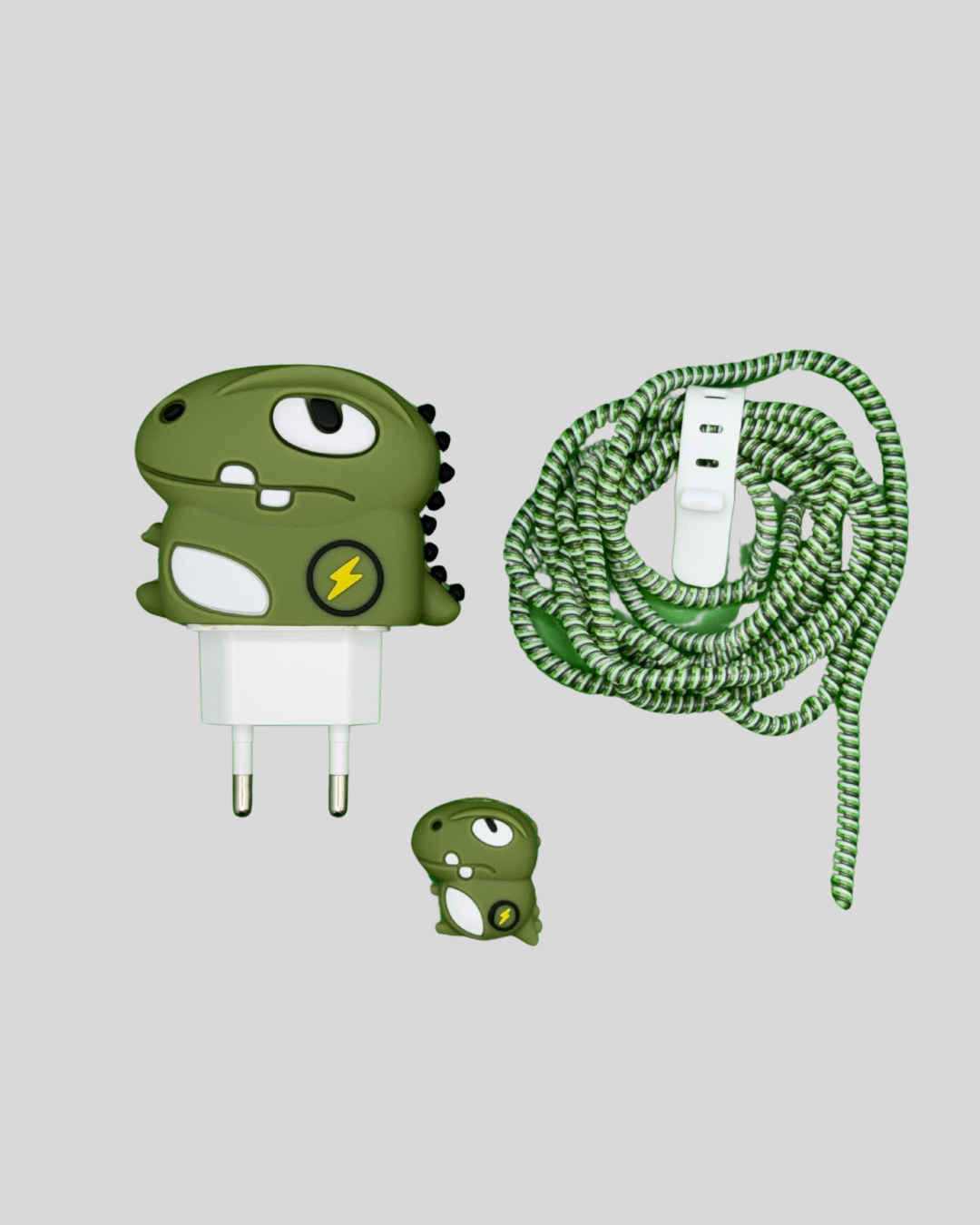 Este increíble set transforma tu "cargador de celular" en un amigable pero feroz dinosaurio, ofreciendo una "protección robusta" y un "toque de personalidad" único. Incluye una "funda decorativa para el adaptador de corriente", un "cable de carga trenzado" con un diseño a juego y un "protector de cable" adicional, todo con la temática de dinosaurio.